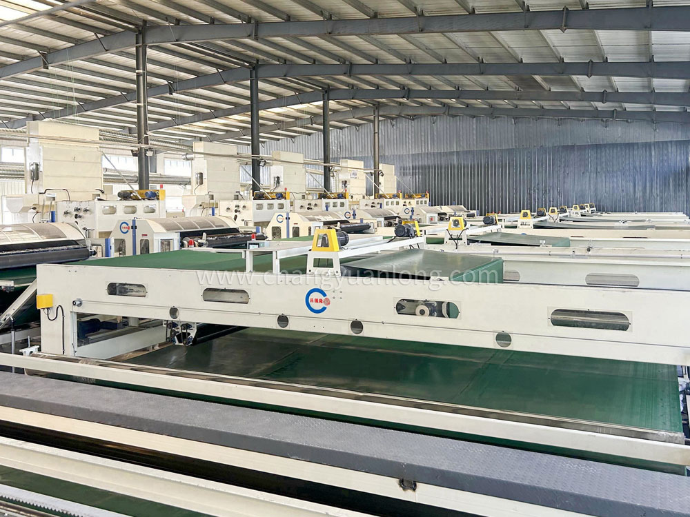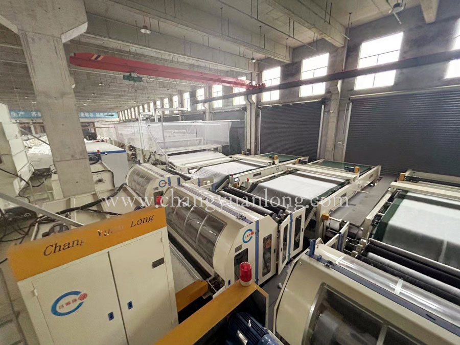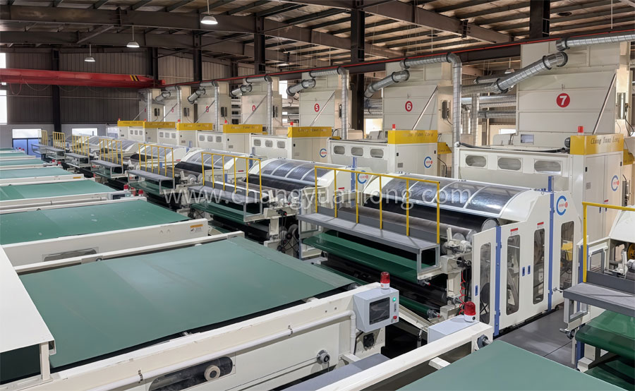 生產線用途:該機組(zǔ)主要生產高彈噴膠棉、仿絲棉。 該產(chǎn)品廣泛應用於服裝、床(chuáng)上(shàng)用品、家(jiā)具等。根據客戶要求可分四機頭、六機頭、七機頭等(děng)。機頭越多,產量越高。