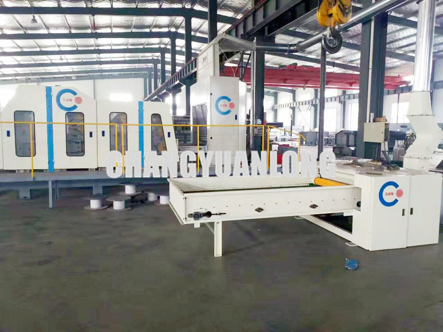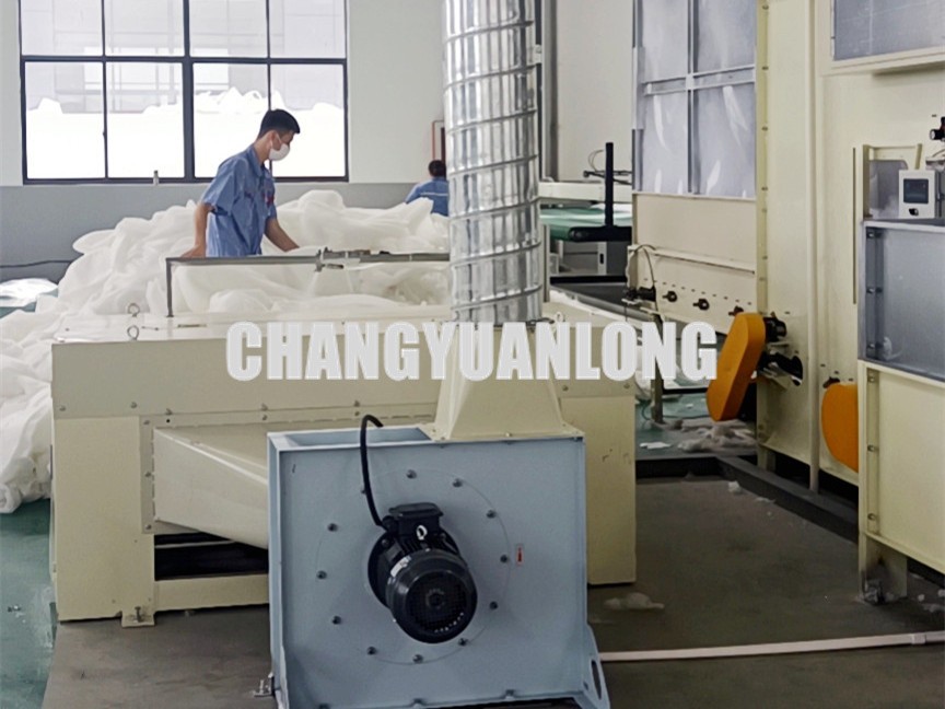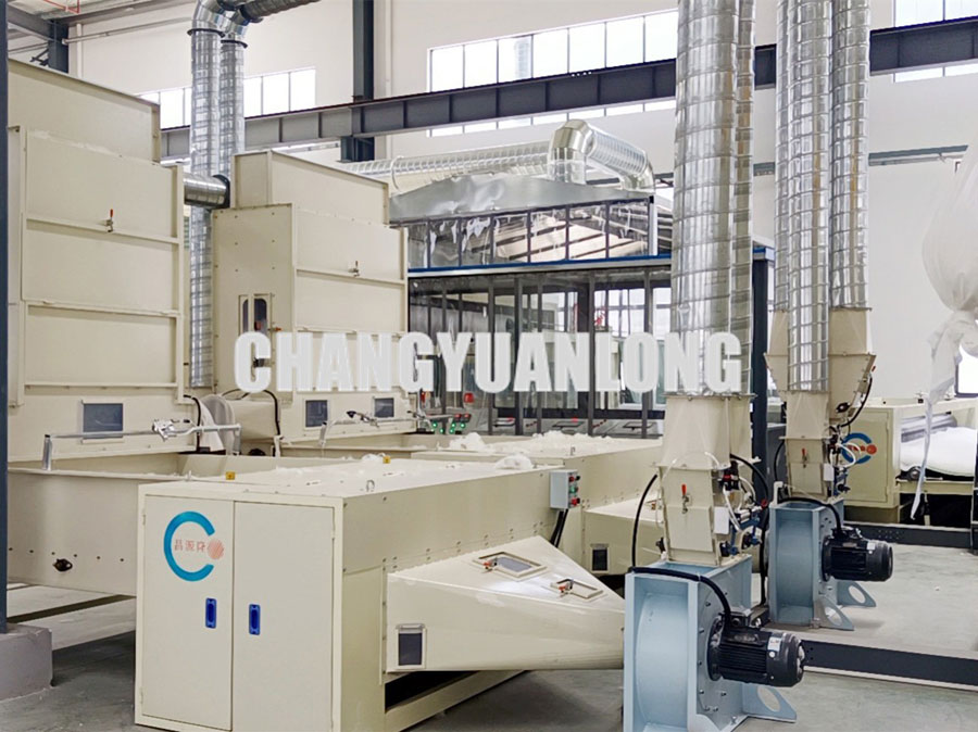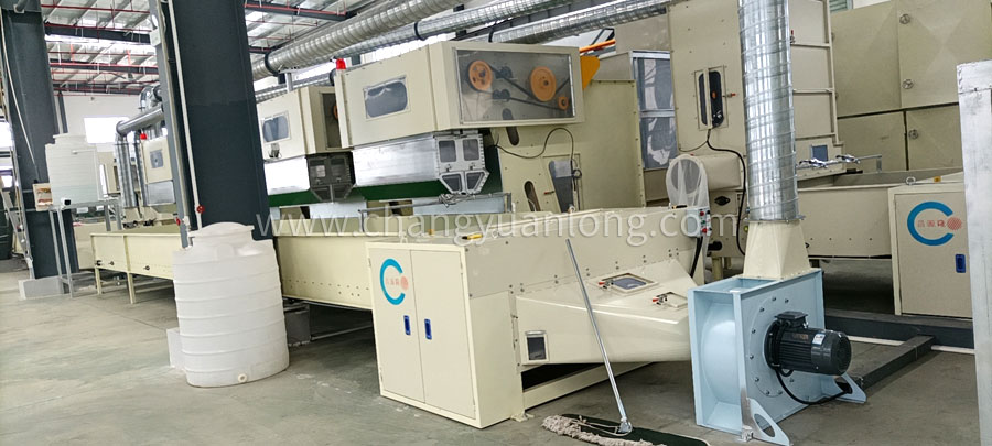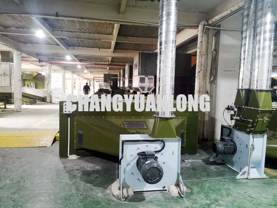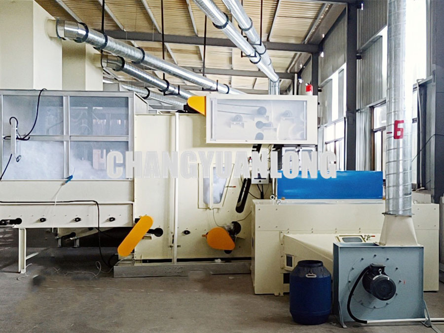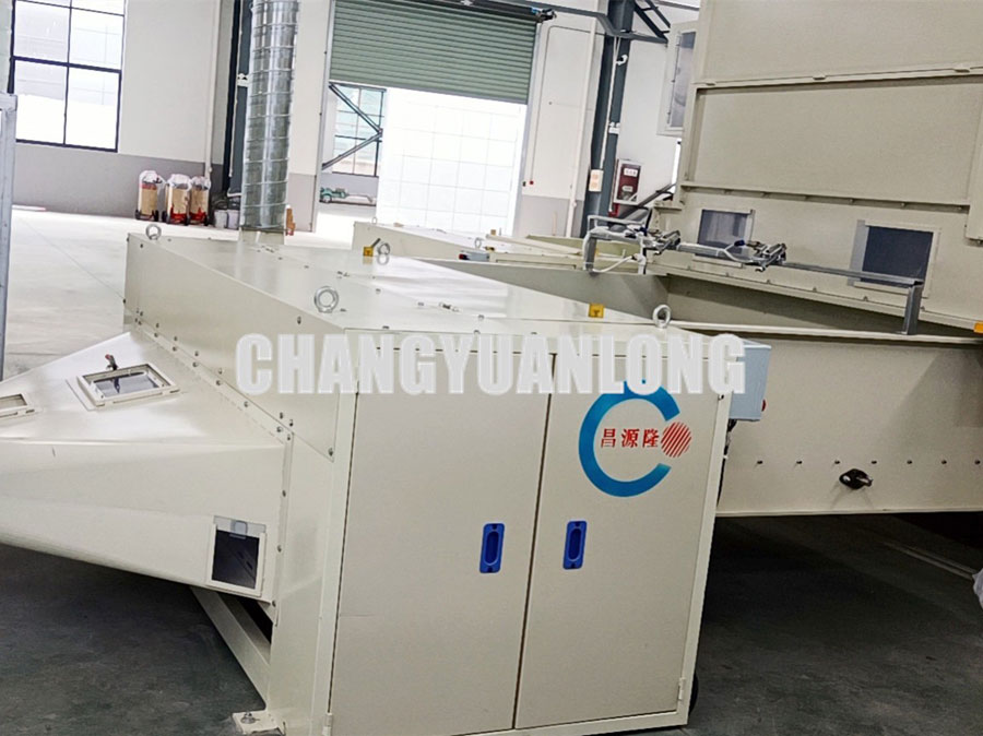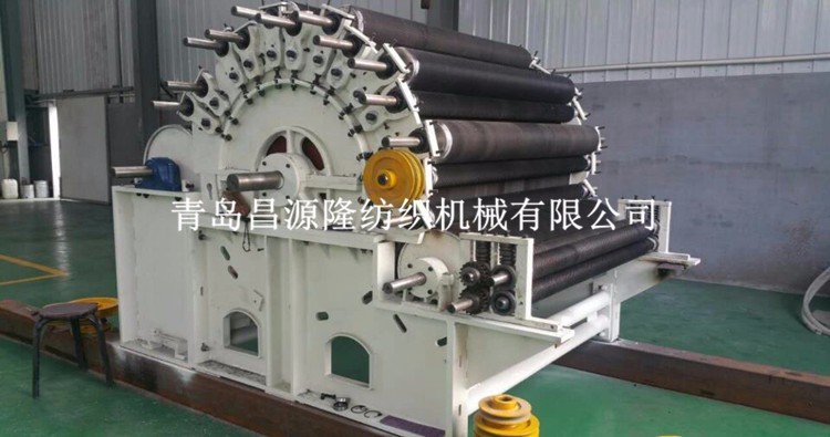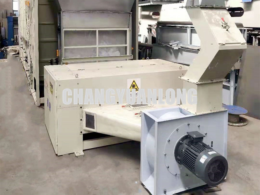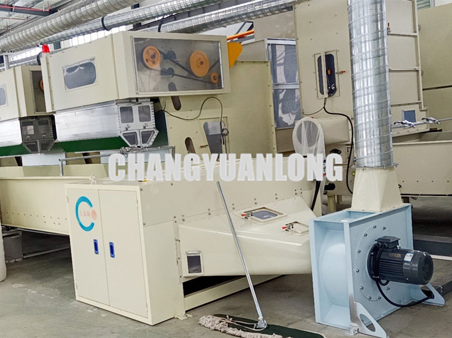 開鬆機:本機開鬆(sōng)效果好,不易纏棉,產量高。把纖維、原料經喂入平簾輸(shū)送至喂入羅拉,再由開鬆輥高速開鬆後,經輸棉風機以適量的風量輸送纖維原料供後道(dào)工作使用;並配(pèi)備橋式除鐵裝(zhuāng)備。