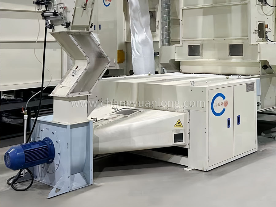 (4)儲棉箱帶強磁鐵除(chú)金屬裝置,輸棉(mián)風機連接PVC輸棉管道(dào),光滑封(fēng)閉,不掛棉不漏風。